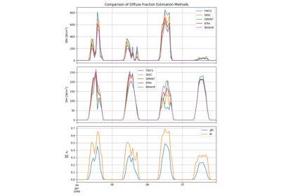 The Boland model [1], [2] estimates the diffuse fraction, DF, from global horizontal irradiance, GHI, through an empirical relationship between DF and the clearness index, \(k_t\), the ratio of GHI to horizontal extraterrestrial irradiance.