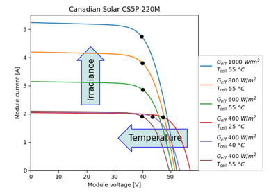 \[I = I_L - I_0 \left[ \exp \left(\frac{V+I R_s}{n N_s V_{th}} \right)-1 \right] - \frac{V + I R_s}{R_{sh}}\]for \(I\) and \(V\) when given \(I_L, I_0, R_s, R_{sh},\) and \(n N_s V_{th}\) which are described later. The five points on the I-V curve specified in [3] are returned. If \(I_L, I_0, R_s, R_{sh},\) and \(n N_s V_{th}\) are all scalars, a single curve is returned. If any are array-like (of the same length), multiple IV curves are calculated.
