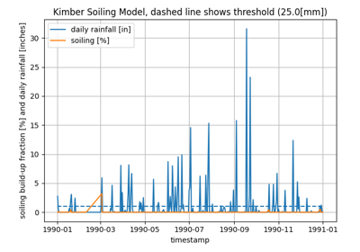 Kimber soiling model [1] assumes soiling builds up at a daily rate unless the daily rainfall is greater than a threshold. The model also assumes that if daily rainfall has exceeded the threshold within a grace period, then the ground is too damp to cause soiling build-up. The model also assumes there is a maximum soiling build-up. Scheduled manual washes and rain events are assumed to reset soiling to zero.